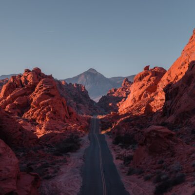 Skyscrapers with glass exteriors rise toward a clear sky at dusk, reflecting light and surrounding buildings. The offices inside are illuminated, creating a vibrant cityscape.
