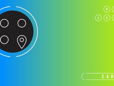 A blue-to-green gradient background with a black circle on the left containing map pin and circle icons. On the right, "MIC 2024" and "CADDIT" appear in white outlined text and circles.