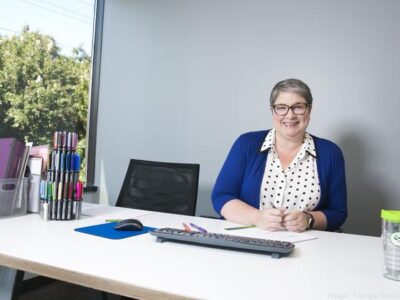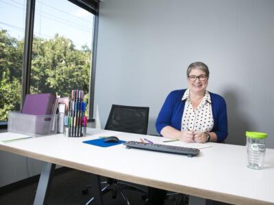 A smiling person with short gray hair and glasses sits at a desk in a modern office, with pens, folders, and a water bottle on the desk and large windows showing greenery outside.