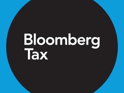 A black circle with the white text "Bloomberg Tax" in the center, set against a bright blue background.