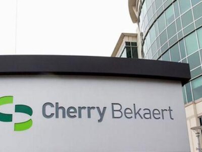 A sign for Cherry Bekaert, displaying the company’s logo and name, stands in front of a modern glass office building.