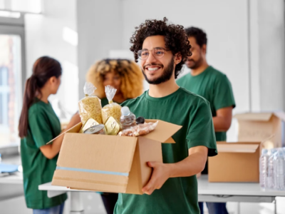 Smiling man in a green shirt holds a cardboard box filled with food items. Three other people in similar shirts work in the background, organizing supplies in a bright room.