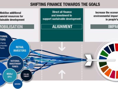 A flow chart shows mobilization of finance from various sources, alignment of finance for sustainable development, and the resulting increased economic, social, and environmental impact depicted as colored segments in a circular graphic.