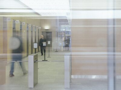 A blurred view through glass of a modern building lobby with light wood walls, people walking near security gates, and a person in a suit standing near the entrance.
