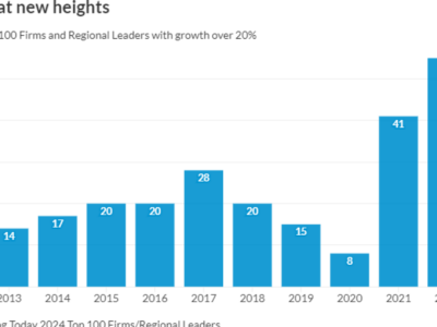 Bar chart showing the number of Top 100 Firms and Regional Leaders with over 20% growth from 2012 to 2023, peaking at 55 in 2022 and 43 in 2023, with lower numbers in earlier years.