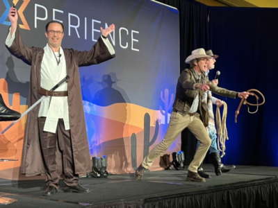 Three men on stage in costumes, one dressed as a Jedi with arms raised, another as Indiana Jones holding a whip, and a third with a lasso. A large backdrop behind them reads “XPERIENCE” with desert-themed graphics.