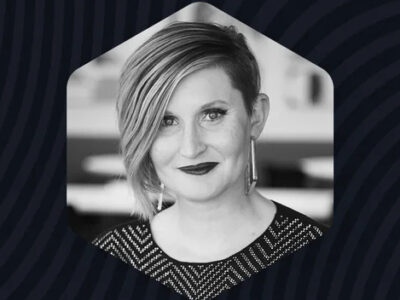 Black and white portrait of a woman with short, asymmetrical hair, wearing geometric earrings and a patterned top, smiling slightly, with a blurred background and dark, patterned frame.