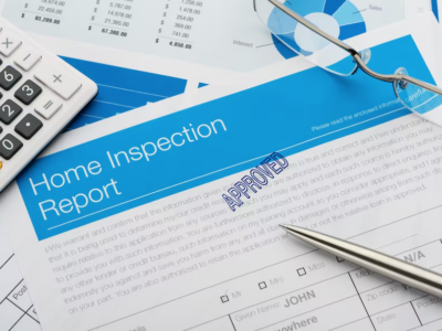Stack of papers labeled "Home Inspection Report" that has been stamped "Approved."