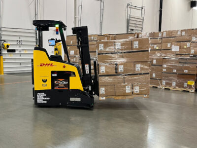 A yellow DHL-branded automated forklift transports a pallet of boxed goods in a warehouse with stacks of similar pallets and large loading bay doors in the background.