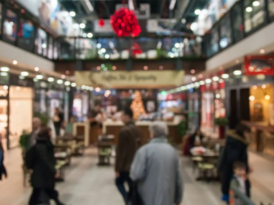 A blurred image of people walking inside a brightly lit shopping mall decorated with red ornaments and holiday lights, suggesting a festive atmosphere.
