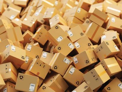A large pile of brown cardboard shipping boxes with various labels and barcodes, stacked chaotically and filling the entire frame.