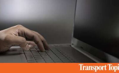 A person's hand typing on a laptop keyboard with a dark background. An orange banner at the bottom displays the text "Transport Topics" in white.