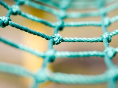 Close-up of green twisted rope knots forming a square mesh net, with a blurred background. The image focuses on the texture and details of the net.