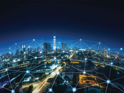A city skyline at night with glowing lines and points overlaying the scene, representing a digital or wireless network connecting various parts of the urban landscape.