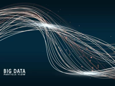 Abstract image of flowing white and orange lines with scattered particles and binary numbers on a dark blue background, representing the concept of big data and particle flow. Text in bottom left reads “Big Data Particle Flow.”.