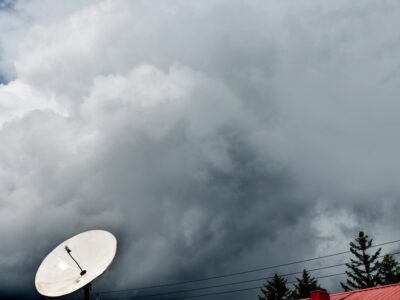 A large white satellite dish points toward the sky under thick, dark clouds, with treetops and power lines visible along the bottom edge of the image.